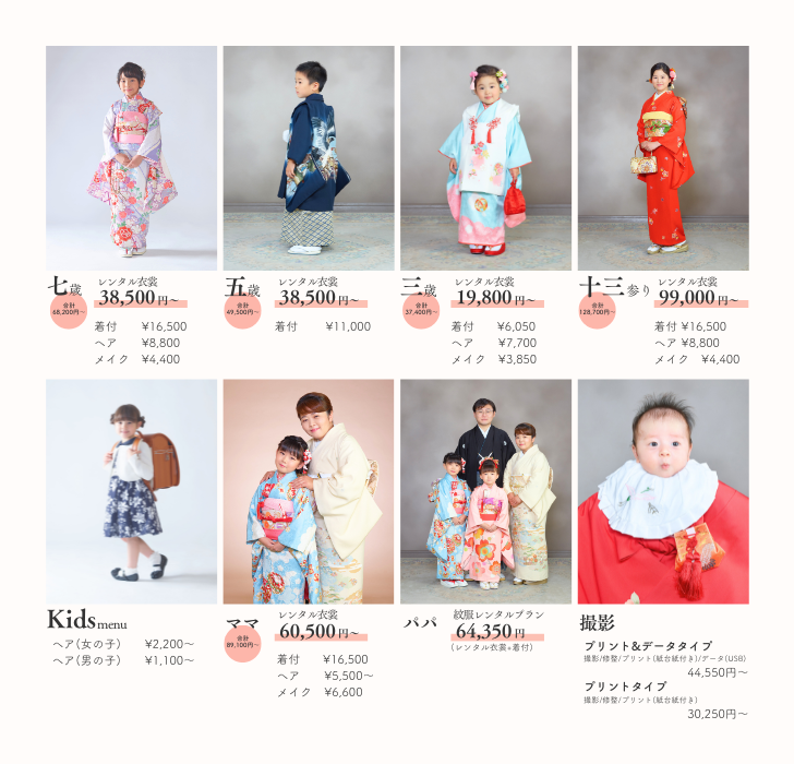 お宮参り、誕生日、七五三、入園・入学、十三参り。